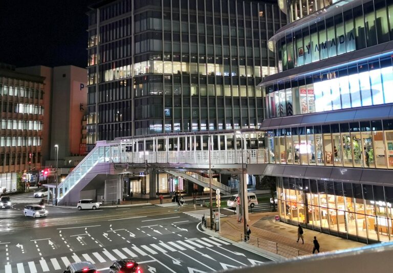 こちらは夜に撮影した電車通りデッキです。結構明るいですね!デッキは24時間通れます。