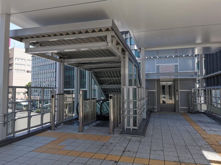 デッキを降りるときは、エレベーターかエスカレーターを使います。右手の方に、階段もあります。