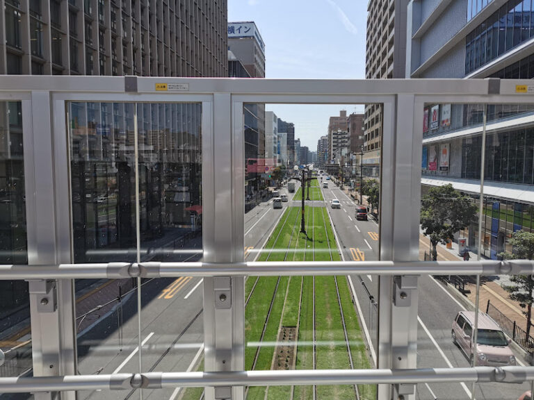 反対側はタイミングがあえば真上から路面電車が見れます。
