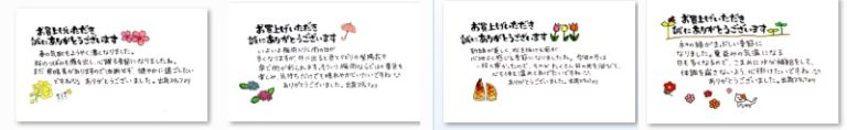 お礼の手書きメッセージカードには、基本的に右上と左下の2個所にイラストをお入れいたします。イラストはご希望のものを2つお書きします。(御社のオリジナル商品イラストでもOKです)